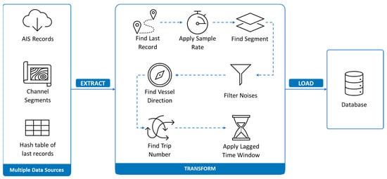 Figure 2. Not only does this procedure help to build customized and useful information to be used instead of raw AIS data but it also helps in making online predictions of vessel movements; it is a big help for the port authorities to know the estimated location of the vessels in a real-time manner when facing a disconnection or a vessel intentionally switch off its location. To do the prediction, some traditional methods and deep learning methods are implemented, and the error of each method has been evaluated. In the following, every component of the ETL pipeline is explained in detail.