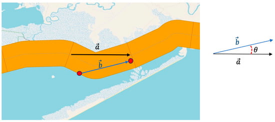 . Next, we consider vector b as the distance difference between the new record and the previous record for each vessel. Finally, we utilize the inner product, Equation (1), to calculate the angle between these two arrows: