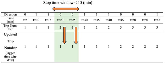 Figure 5, we have a record from an MMSI every five minutes, and the algorithm considers each stop to stop as a single trip. Therefore, before using a time-lagged window, the trip number for this specific vessel can increase to three, while in the movement of the vessel, it stops for about 5 min. If we predefine our threshold at 15 min, based on the time-lagged window, we must ignore the stop status and consider it to be the previous trip number. In this case, we have two trip numbers, since at the third stop, the vessel does not stay less than 15 min. Therefore, we initiate a new trip number.
