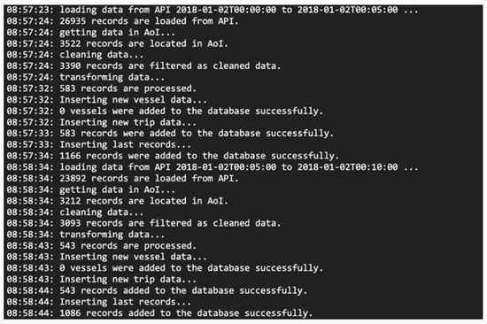 The final stage of the ETL pipeline involves the loading of processed data from the preceding section into a database. We have developed a comprehensive database to store the processed data obtained from the ETL pipeline output. This database incorporates a combination of static and dynamic tables to effectively organize the data. The static tables encompass vessel profile, segments, vessel status, and vessel type. On the other hand, the dynamic tables consist of trips and the last records, which are used for efficient tracking and analysis. As mentioned above, we developed a simulated API to replicate real-world operations of receiving a stream of AIS records. The API uses actual AIS data from 2018 to 2022 but releases them in 5 min time intervals. Then, we connect our pipeline to this API and set it running for all data.