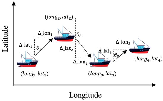 Assuming our aim is to obtain predictions for each specific time interval, we apply Equation (3) to calculate the distance traveled by the vessel within the defined time interval, which is assumed to be 5 min (0.083 h). Regarding [