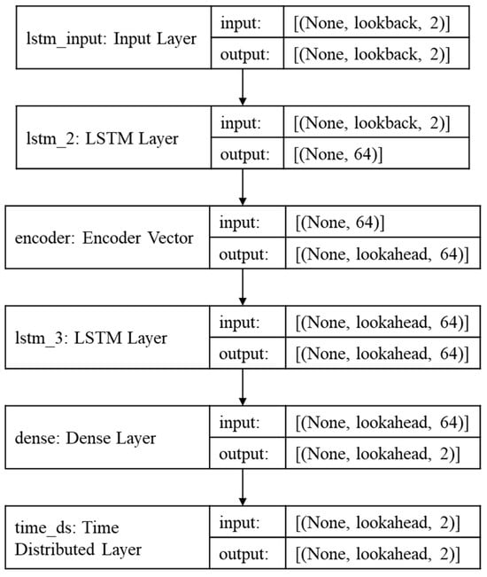 Figure 11. Using TensorFlow, we create a sequence model with 50 epochs and 64 hidden layers. The goal is to predict the vessel’s trajectory based on historical data using this model. The initial step involves selecting the input to the model with a specified lookback value of 5, where 5 denotes the number of features in the X dataset. This input is then fed into the LSTM layer, producing an output with a hidden layer of 64 units and a repeated vector, also known as the encoder vector. This fixed vector is generated ‘m’ times and serves as the input for the subsequent LSTM layer, utilizing the value (lookahead, 64). Consequently, the final output of the model is represented as a lookahead value of 2, where 2 signifies the number of features in the Y dataset. This architectural design enables the model to effectively handle varying lookback and lookahead values during the sensitivity analysis.