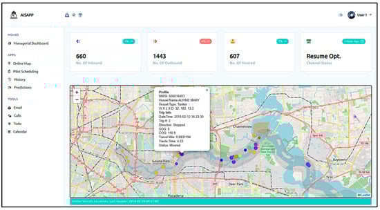 Figure 13. In addition to real-time data, the dashboard provides access to historical information. Users can query various metrics such as traffic flow, dwell time, OD matrix, trip generation, trip attraction, and individual vessel trips. These queries can be filtered based on the vessel type and specific date ranges.