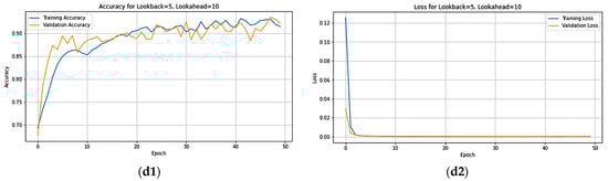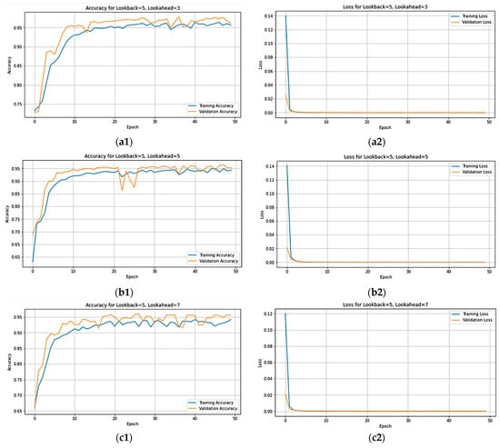 Figure 16 provides a visual representation of both accuracy and loss per epoch. The graphs on the right illustrate the loss per epoch, showcasing closely aligned training and validation curves, indicating that the model is not overfitting. On the left, the accuracy per epoch plots reveals consistently high values, approaching one, indicative of a positive trend. Notably, the a1 plot exhibits particularly promising results, suggesting that selecting a lookahead of three yields enhanced the accuracy. While other lookahead values display slightly decreased accuracy compared to lookahead three, the overall trend remains favorable. This indicates that opting for lookahead values of five, seven, and ten still maintains a satisfactory level of accuracy without a significant decline.