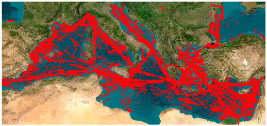Raw AIS data are acquired by transmitters installed on board, synchronizing with the closest AIS station at fixed intervals, where they can be aggregated and stored in streams via a TCP/IP protocol. They consist of the vessel coordinates at a specific time, the vessel speed that corresponds to the overground speed (GPS speed), and the vessel overground heading. The specific dataset used in this work corresponds to approximately ≈ routes (round-trip voyages) of cargo ships (container ships) in the Mediterranean sea. A limited version of the dataset (trajectories) is depicted in Figure 1 for visualization purposes.