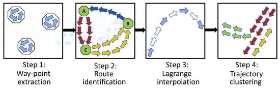Trajectory mining (TM) is a data mining technique used to extract knowledge from trajectory data, which refer to the sequence of spatial locations visited by an object over time [1]. Trajectory mining has been widely applied in various fields, including transportation, health care, tourism, surveillance, and security. In health care, it has been applied to study patient movements and predict disease outbreaks [2]. In tourism, it has been applied to understanding tourist movements to enhance tourist experiences [3,4] and the planning of infrastructure development [5]. In surveillance and security, it has been used to analyze the movement of people and vehicles to detect suspicious activities [6,7]. Above all, in transportation, trajectory mining has been employed to find the most efficient routes for vehicles based on historical trajectory data [8,9], to analyze and predict traffic congestion patterns to optimize traffic flow and reduce congestion [10], and to improve transportation systems overall.