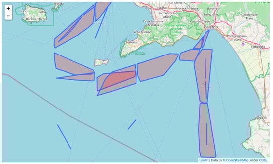 Step 4. The fourth and final step is trajectory clustering. In this step, a modified iteration of the DBSCAN algorithm was utilized to cluster trajectories involving multiple vessels following the same route (from waypoint to waypoint). This clustering was based on various factors, including the geographical location, speed, and heading of the AIS positions. Specifically, the surveillance area was segmented into a grid with a resolution of —a resolution that matches the Copernicus Climate Change Service2 (C3S) and can be utilized in future studies to find optimal route recommendations. In each grid cell, the standard deviations of speed over ground, course over ground, and distance between AIS positions were calculated. We used the standard deviation because it measures the amount of variation or dispersion of a set of values. Positions with the lowest dispersions of speed, heading, and Haversine distance need to be grouped together. Then, a modified DBSCAN algorithm is employed to further cluster the AIS positions of each vessel type and origin–destination waypoints in each grid cell. The modified DBSCAN algorithm employs two more parameters other in addition to the and parameters, which remain the same: the s and c parameters, refer to the speed and the course over ground, respectively. The values of s and c used for the clustering are the previously calculated standard deviation values of speed and course over ground for each grid cell. is the standard deviation of the distance. is set to 6 because we need at least two three-position-length routes per itinerary. Three is the minimum number of positions a trajectory should have to be considered valid. Therefore, clusters with one route are not considered common and are excluded from the process. Then, the convex hulls per cluster are calculated. Consequently, numerous polygons emerged along each route, with each polygon representing the specific area where vessels operated with similar speeds and headings. An illustration of such polygons is depicted in Figure 3. More details about the preprcessing steps can be found in [34,41].