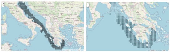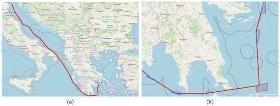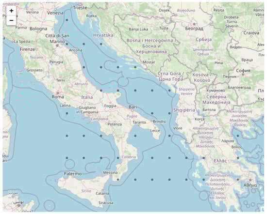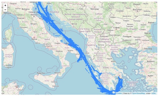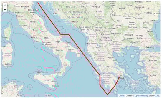 The output of Algorithm 1 is a subset of clusters bounded by the shortest path initially employed by A* in terms of proximity, utilizing an arbitrary, broad sea grid. These clusters contain past trajectories segments of cargo ships corresponding to the specified origin–destination voyage (Venezia–Piraeus), see also Figure 7.