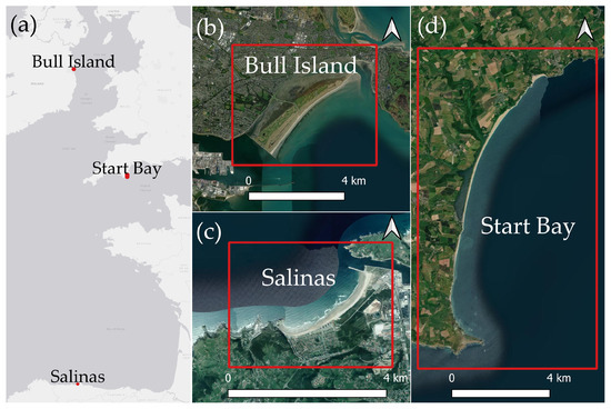 We have selected three different tidally controlled coastal areas in Great Britain, Ireland, and Spain which include sand and gravel beaches backed up by three different environments: low-lying dunes and marsh (Bull Island in Ireland); steep, rocky cliff (Start Bay in Great Britain); and high, sandy dunes (Salinas in Spain) (Figure 2). All three study areas also capture different morphodynamic behaviors and cloud coverage conditions. The details of each study site are described in detail here.