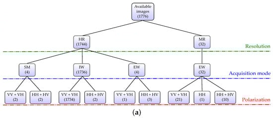 Our study makes use of S1 Level-1 Ground Range Detected (GRD) products, which are freely available at https://search.asf.alaska.edu/#/ (accessed on 6 December 2023) in high resolution or medium resolution (see Table 2). These data consist of SAR data that have been detected, multi-looked, and projected using the WGS84 Earth ellipsoid model. S1 consists of two satellites, which operate at C-band frequency (5.4 GHz), supporting both single (HH or VV) and dual polarization (HH + HV or VV + VH). SAR satellites typically follow two types of orbits: ascending (ASC), in which the satellite travels from the South Pole to the North Pole, and descending (DESC), in which it travels in the opposite direction. Each time the satellite orbits the Earth, it covers the same geographic area twice, once during the ASC pass and once during the DESC pass. As a result, an SAR application can acquire more frequent data over a specific area, which is particularly beneficial for monitoring dynamic processes or rapidly changing environmental conditions. The S1-SAR instrument acquires data in four exclusive modes [23] that differ in resolution, coverage, and revisit time: