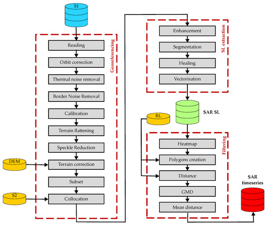 The process of extracting SL and computing rates of SL change from SAR imagery is depicted in the flowchart shown in Figure 4.