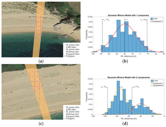 An example of GMD filtering is shown in Figure 6. When the SLs are well concentrated within a polygon, a GMD with a single component is sufficient to statistically describe their distances, as demonstrated in Figure 6a,b. In contrast, for more dispersed distributions, a GMD with multiple components is necessary, as showcased in Figure 6c,d.