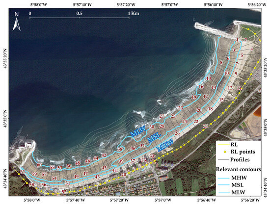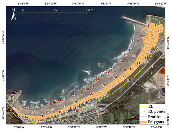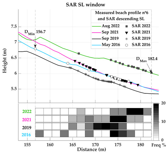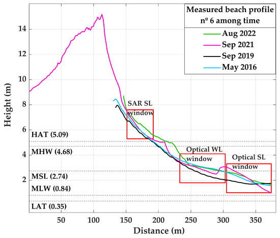- Inter-annual changes based on a qualitative assessment of the erosional/accretional processes observed according to the SAR-SL distance from the baseline in comparison to those observed in topographic field surveys. The beach subaerial topography is monitored on a regular basis by means of in situ surveys provided by the Ministry of the Ecological Transition and the Demographic Challenge of the Government of Spain with a variable precision ranging from 10 to 0.1 m. Four surveys are available since 2015: May 2016, September 2019, September 2021, and August 2022. The topographic surveys cover the beach foreshore and backshore, including the inter-tidal area, berm, and dry beach, up to the toe of the dune or seawall. The survey dated September 2021 also covers the dune seaward slope and crest. From these topographic surveys, the shape of the beach profile is extracted along transects placed in the center of polygons (Figure 7). The vertical reference level for these topographic surveys (chart datum of Avilés Port) is located 274 cm below the local mean sea level. Other vertical references, such as the highest astronomical tide, mean high water, mean low water, and the lowest astronomical tide, are shown in Figure 8 with results of the topographic surveys for beach profile No. 6 as an example, along with the window that indicates where SAR-SLs are identified.