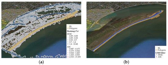 Figure 9 illustrates an overview of the SAR-SLs extracted for Bull Island. They were generated by processing the available SAR images between June 2016 and March 2022. As RL, the high-water-mark shoreline produced by Ordnance Survey Ireland (https://www.geohive.ie/pages/data (accessed on 6 December 2023)) was used. Along the RL, 93 polygons were created, and for each of them, SAR CRs were produced in order to validate it “quantitatively”. The speckle effect is minimal along the front beach (Figure 9a). The majority of the SLs appear to be well concentrated and unaffected by sea conditions, suggesting a relatively calm environment during data acquisition. Figure 9b illustrates the points selected for the annual SL CR after applying a minimal filter (heatmap >0.175%) and the GMD technique. Considering the flat beach geometry, the authors note that there is good overall agreement between the results obtained from SAR ASC and DESC tracks. The geometry distortions (shadows/layovers) do not appear to have a noticeable effect on the SLs. This results in the SLs tending to overlap with one another. The slight differences observed are attributed to variations in the number of SAR images available. Bull Island is not covered equally from ASC (759) and DESC (386) tracks, which may lead to minimal differences in certain polygons.