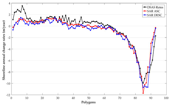 Profile format comparison between DSAS and SAR CRs. Annual SL CRs were calculated for each polygon using the two methodologies described previously. The profiles show very strong agreement between SAR ASC and DESC tracks and strong agreement between DSAS and SAR change rates.