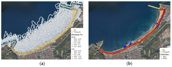 In the third step, for each polygon, the distance () between each point along the SL and the RL, within the boundaries of the respective polygon, is calculated. This distance represents the minimum separation between individual SL points and the RL points. Figure 5d illustrates an example of this calculation. Additionally, a sign is associated with the distance; when a point along the SL is located seaward with respect to the RL, a positive sign is assigned to its distance value, whereas a negative sign is given when it is positioned landward with respect to the RL.