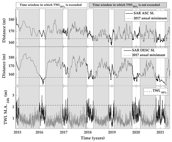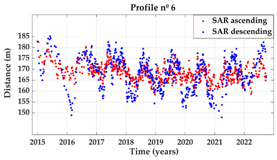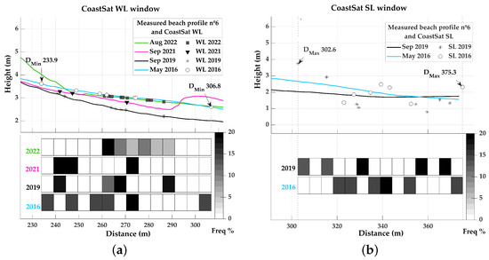 Additionally, to compare the results that we can obtain from SAR and optical sensors, satellite-derived shorelines (WLs) from S2 images are obtained with the CoastSat tool [42]. The water lines represent the water–sand interface at the moment in which the image was taken. After a visual inspection to remove lines located outside the inter-tidal area, 169 WLs were kept between 2015 and 2022. The position of the shorelines from optical images was obtained as the distance from the baseline in the 61 beach profiles in Figure 7. CoastSat WLs were transformed into datum-based SLs using the total water level (TWL) at the moment in which the image was taken and the beach slope from the topographic surveys to project the WL horizontal position onto the mean low water (MLW) datum (84 cm above the chart datum). Figure 8 shows the windows where CoastSat WLs and datum-based CoastSat SLs are located across beach profile No. 6 as an example.