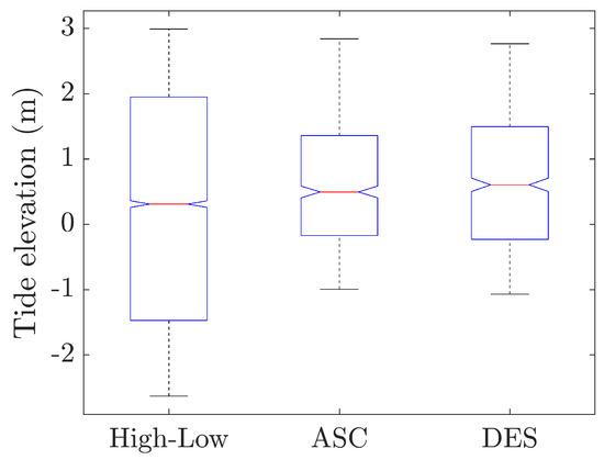 To address the question regarding how much of the tidal range is captured by the SAR dataset at Start Bay, we used astronomical tide model POLTIPS3 tidal prediction software (POLTIPS-3; Standard version 3.9.02/21 Standard) [43], which allows us to compute the astronomical tide around 700 UK ports using harmonic components provided by the National Oceanographic Centre. The tide elevations (daily high and low tides) are computed at Start Point relative to the chart datum and are converted to the ordnance datum using Vertical Offshore Reference Frames software (VORF; version 2.11) [44]. The datum used for the British mainland (and some of the closer offshore islands) is called Ordnance Datum (Newlyn), as it is based on the average value of the mean sea level at Newlyn for the six-year period from 1915 to 1921. Due to the subsequent rise in mean sea level, this datum is now about 0.2 m below mean sea level at Newlyn. The tide level at the time when the satellite data were collected is obtained through linear interpolation of the daily high and low tides using the date and time (in coordinated universal time).