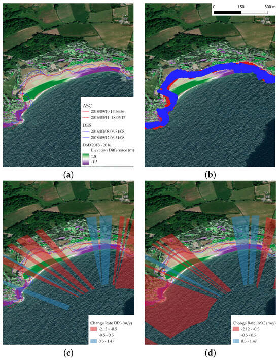 To better understand the location of the SAR-SLs and the ability to capture beach rotation, we used high-resolution digital terrain models (DTMs) publicly available via the National Network of Regional Coastal Monitoring Programmes of England (available at https://coastalmonitoring.org/ (accessed on 6 December 2023)). We used the filtered LiDAR data in ASCII format at 1 m resolution for the years 2016, 2018, and 2021, as shown in Figure A2 in Appendix A. Each tile is 5 × 5 km and aligned to the Ordnance Survey National Grid. Each pixel represents 1 m spatial resolution on the ground, and elevations are referenced to Ordnance Datum Newlyn. Errors in elevation DTM values are of the order of ±0.5 m. We used the QGIS plugin named “Value Tool” to extract the elevation along each SL from the DTM closest in time to the time of the SAR data collection. We used the QGIS raster calculator to obtain the digital elevation model of difference (DoD) that represents the elevation difference between two time-stamped DTMs. The DoD is calculated by subtracting the elevation at each pixel of the most recent DTM and the elevation of the oldest DTM, resulting in negative values indicating losses in elevation or erosion and positive values indicating gains in elevation or accretion. Visualizing the SAR-SLs over the DTMs and the DoD allows us to assess if they capture different elevations and areas of change.