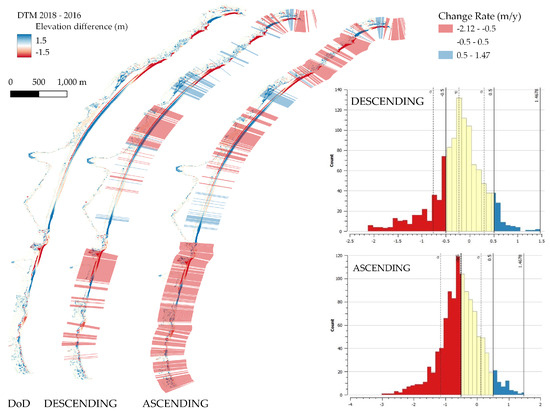 Overall, there is a high degree of alignment between the CRs derived from DSAS and SAR shorelines. This is confirmed in the visual inspection of the profiles (Figure 10) and the strong correlation coefficients () between the two datasets (Table 5). In general, SAR annual SL CRs are lower than the DSAS counterparts, in both average values and coverage. Regarding the mean rates, the SAR CRs are lower than the DSAS rates (∼0.5 m/year) and display larger receding rates. The receding shoreline extent is larger in both SAR passes (ASC/DESC) when compared with DSAS rates.