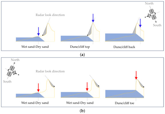 SLs in ASC and DESC tracks in two possible scenarios (flat beach (a) and cliffs (e)). (b,f) SLs points from ASC tracks. (c,g) SLs points from DESC tracks. (d,h) Overlapping of SLs points from ASC and DESC tracks.