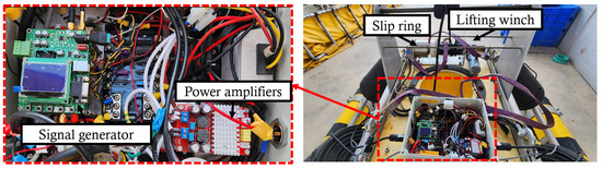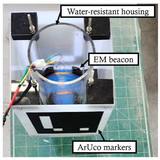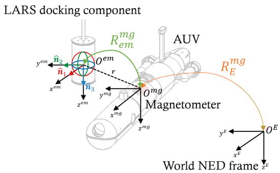 The localization and docking procedure is typically supported by various sensors, including acoustic sensors, vision cameras, electromagnetic (EM) field sensing, or a fusion of multiple sensors [8]. Acoustic sensors offer long-range detection capabilities but have relatively low resolution and update rates (≈1 Hz) [9]. Vision cameras provide high-precision positioning information but are susceptible to water turbidity and lighting conditions, relying on a continuous line of sight to maintain localization [10,11]. EM guidance, on the other hand, is immune to water conditions and line-of-sight limitations, making it an ideal choice for the critical final stage of docking known as the terminal guidance phase [12,13,14].