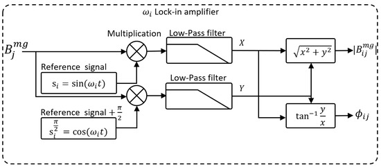 The magnetic flux density of the i’th coil, , was extracted from the magnetometer’s measurements using a digital implementation of lock-in amplifiers (LIAs) [27]. These LIAs detect both the amplitudes and phases of signals that correlate with internally generated reference signals, as defined by: