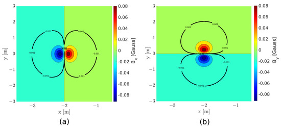 (a) The magnetic flux density of and (b) on the plane was calculated by solving Equation (1) for a coil with a diameter of 0.12 m, 370 turns, and a DC current of 3.2 A. Contours at the 0.001 G level illustrate the dipole field’s shape, with the line in (a) and in (b), indicating points where components of the magnetic flux density change direction.