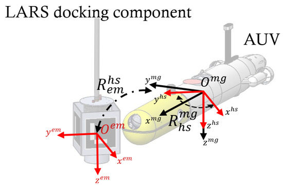 Spatial configuration of the AUV, docking component, beacon, body, and reference frames at the “handshake” moment.