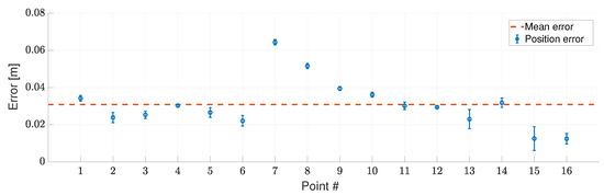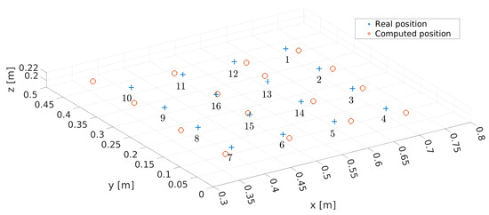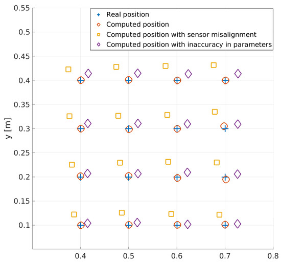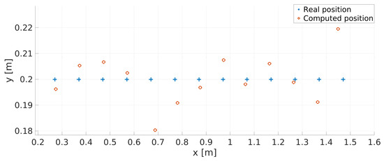 Ultimately, the signed values of , , and were inserted into the position computation function. This function employed the LM (least squares) method, implemented using the Mobile Robot Programming Toolkit (MRPT) library [34], to compute and by solving Equation (17), as outlined in Algorithm 2.