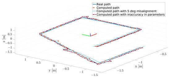 To assess the algorithm’s robustness comprehensively against potential errors and sensor misalignment encountered in real-world applications, the simulation was repeated with simulated sensor misalignment errors. These errors included angular deviations of in roll, pitch, and yaw between the magnetometer and the AUV frames, along with a 10% error in modeling magnetic moments, .