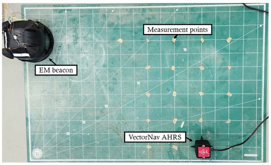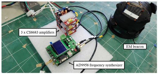 where represents the coil’s cross-sectional area, denotes the number of turns, is the current, is the frequency, and is the phase of the coils’ excitation current. The orientation of each coil in the EM beacon frame is defined by , where: