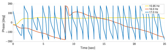 Subsequently, the transformed signals, , were processed by a digital implementation of LIAs. This process involved multiplying the signals by time-dependent sine and cosine functions corresponding to the beacon’s frequencies. These products were then filtered using fourth-order Butterworth low-pass filters with a cutoff frequency of 0.4 Hz. The filters were digitally implemented using the IIR filter library. The filter outputs were further processed to extract the amplitudes , , and and the phases , , and by implementing Equations (13) and (14).