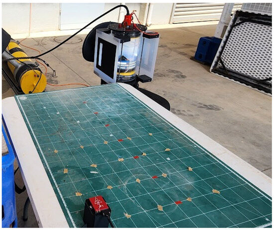 Following filtration, the signals were multiplied by the rotation matrix, , to compensate for the AUV’s rotation and transform into the “handshake” frame. The rotational matrix. . was computed by implementing Equation (4) and the angles described by Equation (16), where , , and were determined using the ArUco marker detection algorithm [32]. The algorithm uses acquired images of markers with unique binary patterns and prior knowledge of their type and size to calculate their position and orientation. The markers were aligned with the beacon axes to provide the beacon’s angles with respect to the AUV.