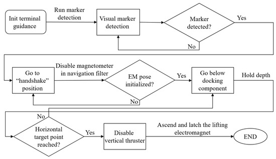 After initialization, the AUV is directed to descend below the docking component by adding 0.5 m to the beacon’s computed position. This measure is implemented to prevent potential collisions between the docking component and the AUV’s hull and appendages. Upon reaching this depth, the AUV’s horizontal controller is activated to position the AUV horizontally beneath the docking component, maintaining a margin of 15 cm. The position computed by the EM positioning algorithm serves as the desired goal point. Within this range, the slow ascent process is initiated by turning off the vertical thruster, allowing the positive buoyancy of the AUV to gradually lift until it is securely attached to the lifting electromagnet. Throughout the terminal guidance, the AUV’s surge and sway motion controllers are restricted to a maximum speed of 0.1 m/s. Moreover, it should be noted that the AUV’s navigation filter provides a dead-reckoning positioning solution to facilitate continued control in scenarios where the magnetometers lose signals from the beacon.