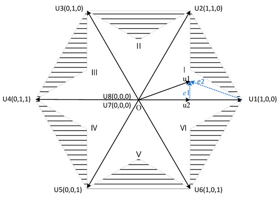 From Figure 5, it can be observed that when the target voltage is u1, in the case of the traditional control strategy, the voltage control vector U1 closest to u1 should be used, resulting in a control error of e2. On the other hand, when employing the three-vector control strategy, the nearest non-zero vectors, U1 and U2, and a zero vector are combined to form a virtual voltage vector for control, resulting in zero control error.