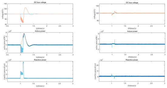 Under normal operating conditions, the DC bus voltage remains stable at 100 kV. When t = 1 s, a three-phase symmetrical fault occurs at the wind-farm-sending-end connection point. It is cleared at t = 1.1 s. The simulation results for traditional MPC and three-vector ADRC-MPC are shown in Figure 14 and Figure 15. The results indicate that after the three-phase short circuit fault, three-vector ADRC-MPC achieves faster stabilization in both DC bus voltage and active power control compared with traditional MPC by approximately 0.15 s. Once stabilized, the voltage and active power fluctuations are also smaller, demonstrating a better fault recovery capability.