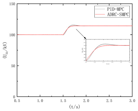 Under normal operating conditions, the direct current (DC) bus voltage stabilizes at 100 kV. At t = 1 s, when the load resistance decreases to 80% of its original value, the system enters a transient state. The simulated results of traditional MPC and the proposed three-vector ADRC-SMPC control are depicted in Figure 16 and Figure 17. The steady-state performance of both methods is relatively consistent. However, a noticeable difference arises after 1 s. When employing the three-vector ADRC-SMPC control proposed in this study, the abrupt variation in the direct current bus voltage is markedly smaller compared with traditional MPC. Additionally, the time required to restore stability is significantly reduced, allowing the system to rapidly return to a steady-state operation, thereby achieving the objective of self-disturbance rejection.