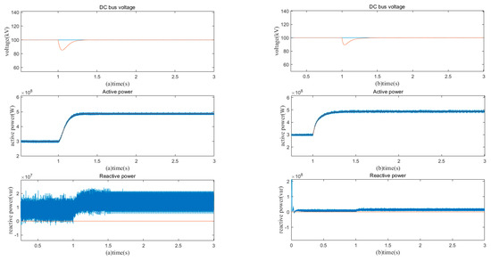 Under normal operating conditions, the DC bus voltage is stable at 100 kV and the reactive power is 0 VAR. The control results for the three-vector ADRC-MPC and the three-vector ADRC-SMPC with DC bus voltage added to the value function are shown in Figure 8 and Figure 9. The outcomes reveal that both the three-vector ADRC-MPC and the sequential three-vector ADRC-MPC effectively manage voltage and power. Active power is consistently controlled at 300 MW, whereas the reactive power remains around 0 var. However, the sequential three-vector ADRC-MPC, including the direct current bus voltage in the cost function, results in a narrower fluctuation range in the direct current bus voltage during control, thereby exhibiting superior control effectiveness.