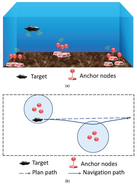 For accurate target localization and navigation, different methods have been developed using angle of arrival (AOA) [], time of arrival (TOA) [], time difference of arrival (TDOA) [], received signal strength (RSS) [], among which the TOA and TDOA are the two most popular methods adopted in underwater environment. Beck et al. [] developed the least squares (LS) approach for positioning a radiating source from circular TOA-based measurements. Carevic [] proposed a nonlinear LS technique in computing the motion parameters for each target in a TDOA-based multi-target localization in the 3D space.