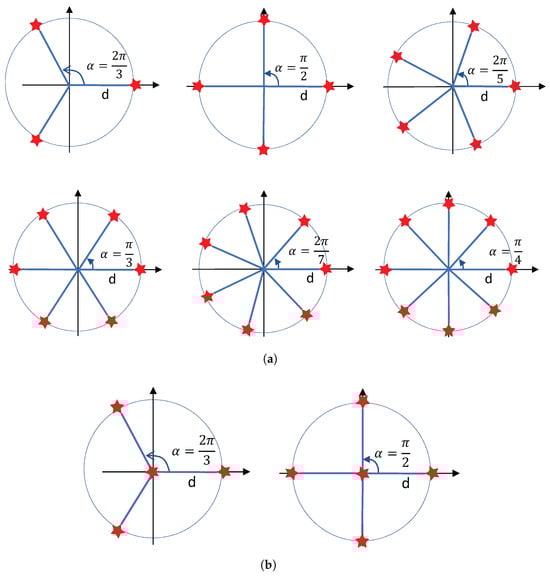 Due to the sparsity of discontinuous coverage in the deployment of the SGN, the service range of a set of anchor nodes has become a very important indicator. It has been proven that the optimal geometry for multi-static TOA localization is symmetric []; thus, we mainly consider the symmetric deployment strategy of SGNs. Moreover, the symmetric deployment strategy can provide consistency services in all directions.