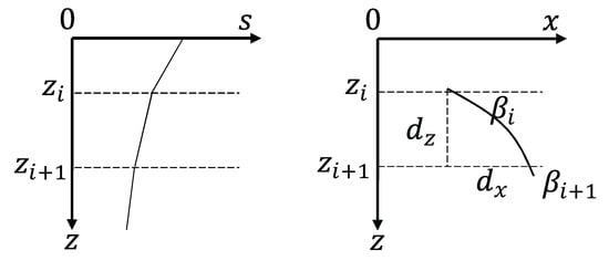 As mentioned earlier, the variety of sound speed causes signal propagation path bending, and sound speed changes are typically described using a layered ray model according to [,]. We let the sound speed profile be . For a single linear sound speed layer unit, as shown in Figure 4, there is a relationship between the signal propagation path and the horizontal propagation distance: