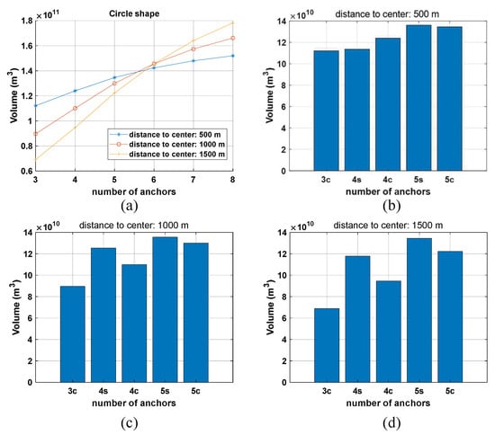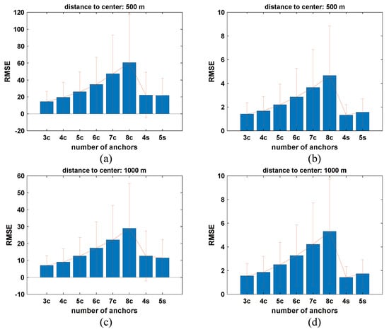Figure 5 shows the coverage range performance of different SGNs with different numbers of anchors, where in Figure 5b–d, “4c” means four anchors forming a square distribution (circular shape), “4s” means four anchors forming a star shape. From Figure 5a, the coverage range of the SGN expands as the number of nodes increases, and the growth trend significantly weakens after exceeding five nodes. With less than six anchors, the result shows that reducing the distance between the anchor and the center can increase the coverage range, but as the number of nodes increases further, reducing the distance between the anchor and the center reduces the coverage range. From Figure 5b–d, the results of “3c” and “4s” indicate that adding an anchor at the network center can increase the coverage range, and the range increase effect is related to the distance from outer anchors to the center. According to the results of “4s” and “4c”, “5s” and “5c”, it can be seen that under the same number of anchors, the star-shaped network has a larger coverage range. Comparing “4s” and “5s”, the coverage improvement brought by increasing nodes is not as significant as that of circular SGNs. For coverage performance, a star network composed of four or five nodes is a better choice for SGN construction.