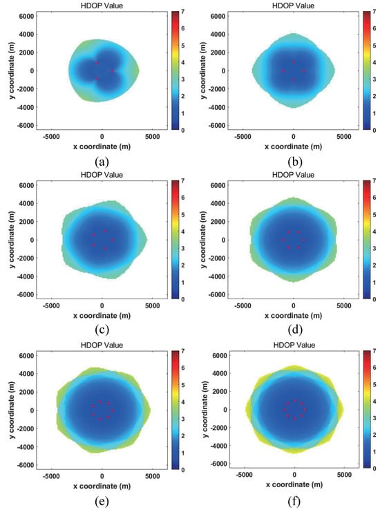 The purpose of SGN deployment design is to provide PNT service for underwater vehicles, so the accuracy performance is of great importance. To evaluate the positioning accuracy performance of different network shapes, the HDOP is shown in Figure 6 and Figure 7 when the receiver moves around at a depth of 500 m. In Figure 6 and Figure 7, a smaller value indicates better positioning accuracy, because small ranging errors do not cause large positioning errors at these positions. From Figure 6, it can be seen that as the number of nodes increases, the area of high-quality service regions also increases. However, the growth rate slows down when it exceeds five nodes. Though the service areas grow when the number of nodes increases, the service quality in the surrounding areas is not satisfactory that the colors of these areas are yellow and red. This is mainly because the reference node positions are too concentrated or even approximated to be on the same straight line, which makes the positioning results very susceptible to sonar measurement errors.