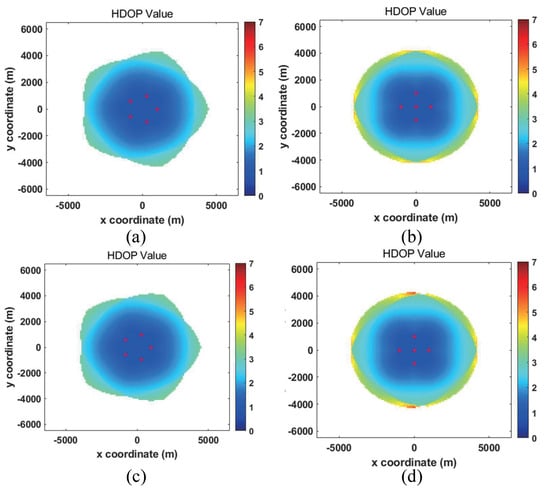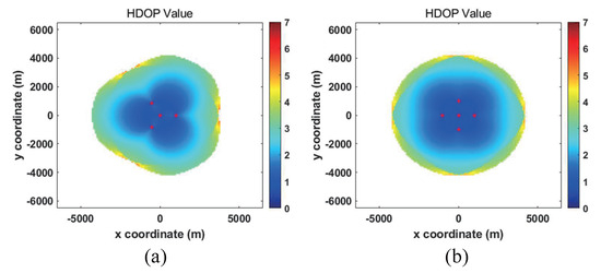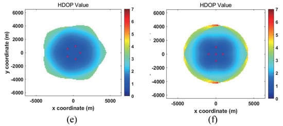 Comparing Figure 7a and Figure 6b, it can be seen that the service coverage area is roughly the same, but the high-quality service area of the circular configuration is larger, while the service quality of the surrounding areas of the star configuration is seriously deteriorating due to the topological issues of reference anchors. When adding an anchor at the center of Figure 6b to form a five-point star network as shown in Figure 7b, the service coverage becomes larger and has better symmetry. By comparing Figure 7b and Figure 6c, the high-quality service areas (low HDOP values) of the five-node star network and the five-node circular network are roughly equivalent, but the low-quality service areas of the star network are more balanced, which means that the average service quality of the star shape is more suitable for SGN. Considering the coverage performance and economic cost factors, adding an anchor at the center of Figure 6b to form a five-point star network is a good choice for anchor deployment.