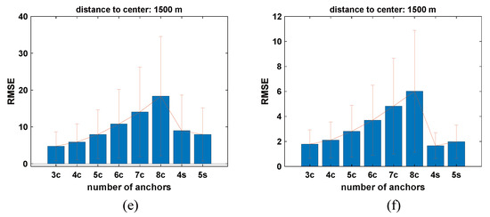 To further evaluate the accuracy performance of different kinds of SGNs, we conduct some simulations as shown in Figure 8, where (a), (c), (e) are results with no position constraints of target nodes. (b), (d), (f) are results in which the position of the target node locates around the center of the network topology when it is projected onto the seafloor. The root mean square error (RMSE) of localization is adopted in this paper to evaluate the accuracy performance. From Figure 8a,c,e, localization error increases obviously as anchor nodes increase. This is because when the target node is located at the edge of the coverage range, the network structure of the anchor node is not good, so although the target node can be located, it cannot guarantee the quality of positioning service. If we focus on target nodes near the perpendicular in the network topology with difference depth, the positioning error can be reduced according to Figure 8b,d,f. Comparing “4s” with “4c”, “5s” with “5c” in Figure 8b,d,f, adding an anchor in the middle of SGN can significantly improve the quality of positioning services in the central area as shown in Figure 8b,d,f, which further indicates that the “5s” star topology is a network configuration with good overall performance.