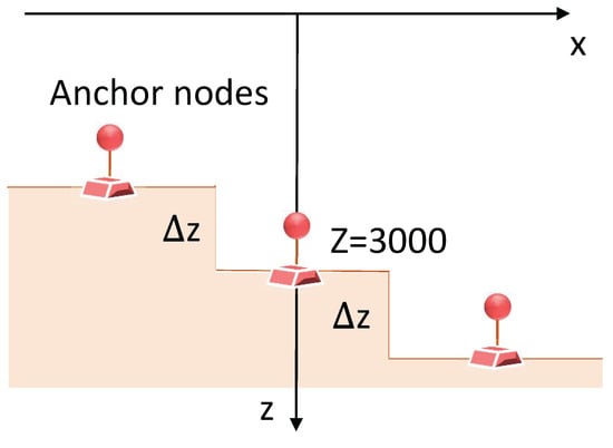 In fact, the seabed terrain is complex and diverse, making it difficult to meet completely flat conditions. In this section, we consider a “stepped” terrain as shown in Figure 9, and positions of five anchor nodes are given in Table 2, where Scenario 1 is when m and Scenario 2 is when m.