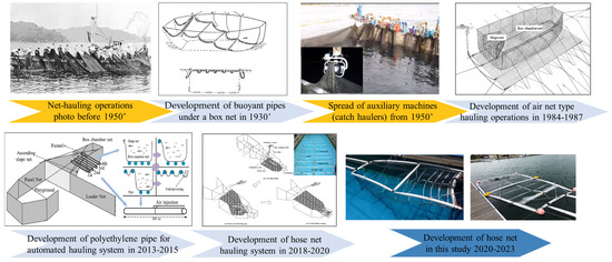 The process of guiding fish ensnared within a box chamber net towards the fishing vessel is referred to as ‘net-hauling operations’. Typically, the hauling system necessitates a significant workforce for the task of raising the nets. A summary of the technological advancements in net-hauling operations is presented in Figure 2 [5,6,7,8,9,10].