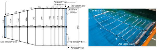 As it is not efficient to reproduce the many buoys that are the buoyant material of the box net in the experiment, we created the buoyant part by using hoses with a diameter of 100 mm instead, as shown in Figure 4 and Table 2. These hoses were interconnected using caps and air pipes.