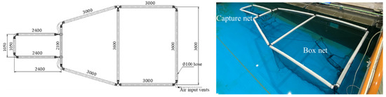 The hose net ascends in a shape designed to drive fish, and it naturally settles due to the exhaust process after the harvesting operations. In this study, we utilized a model consisting of the box chamber net of a large set net. The physical net used for practical applications has dimensions of 60 m in length, 36 m in width, and 30 m in depth. For the purpose of water tank testing and semi-field experiments, a scaled-down 1/10-size hose net model was used within the box chamber net.